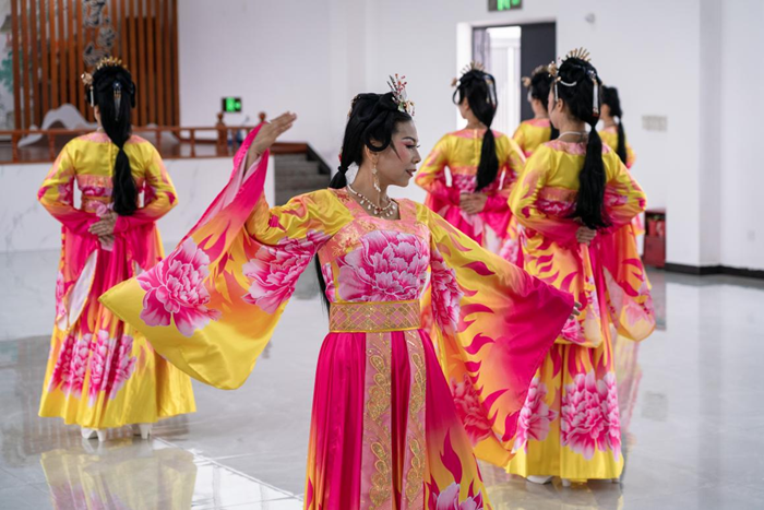 8月31日,浙江省台州市临海市白水洋镇桃源村的舞蹈队在表演间歇换装。新华网 钟奕 摄