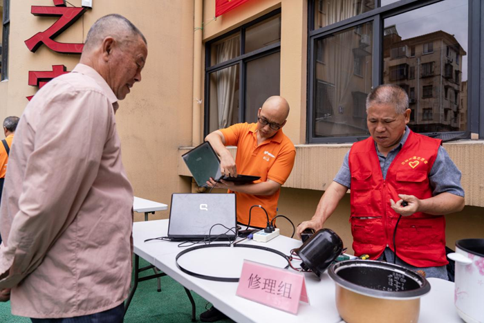 8月31日,浙江省台州市临海市鹿城社区温暖之家的志愿者们正在为居民免费修理家用电器。新华网 钟奕 摄