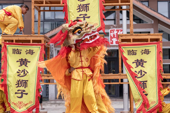 8月31日,浙江省台州市临海市白水洋镇上游村狮子班正在表演国家级非物质文化遗产狮舞(黄沙狮子)。新华网 钟奕 摄