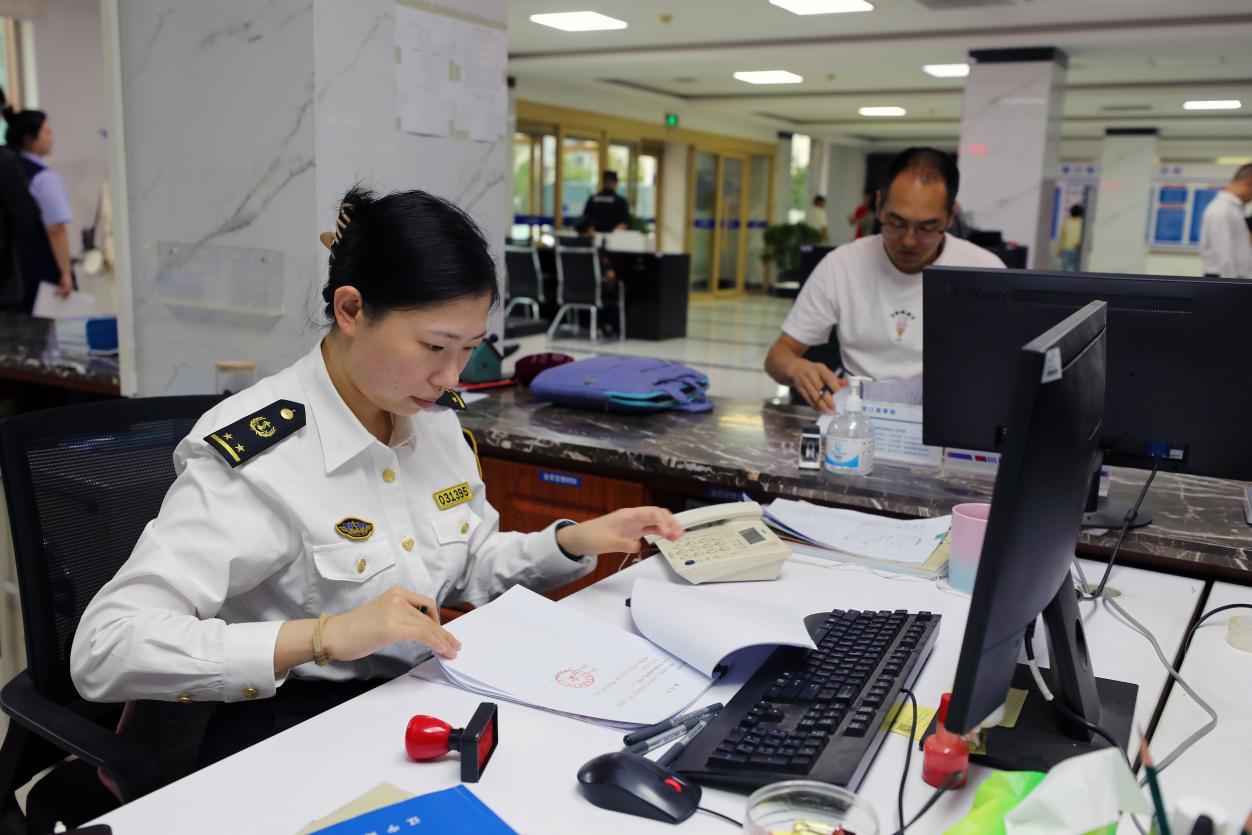 图为营口海事局服务大厅工作人员正在办理业务(9月22日摄)。新华网发(刘舒摄)