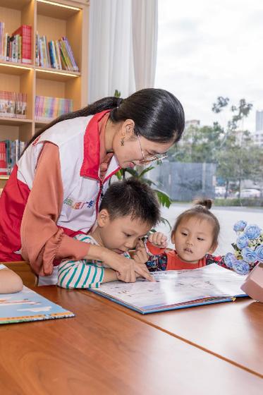 2023年12月14日,广东省深圳市龙华区新时代文明实践中心学习社,志愿者正在陪同小朋友在一起学习科普读物。新华网 钟奕 摄