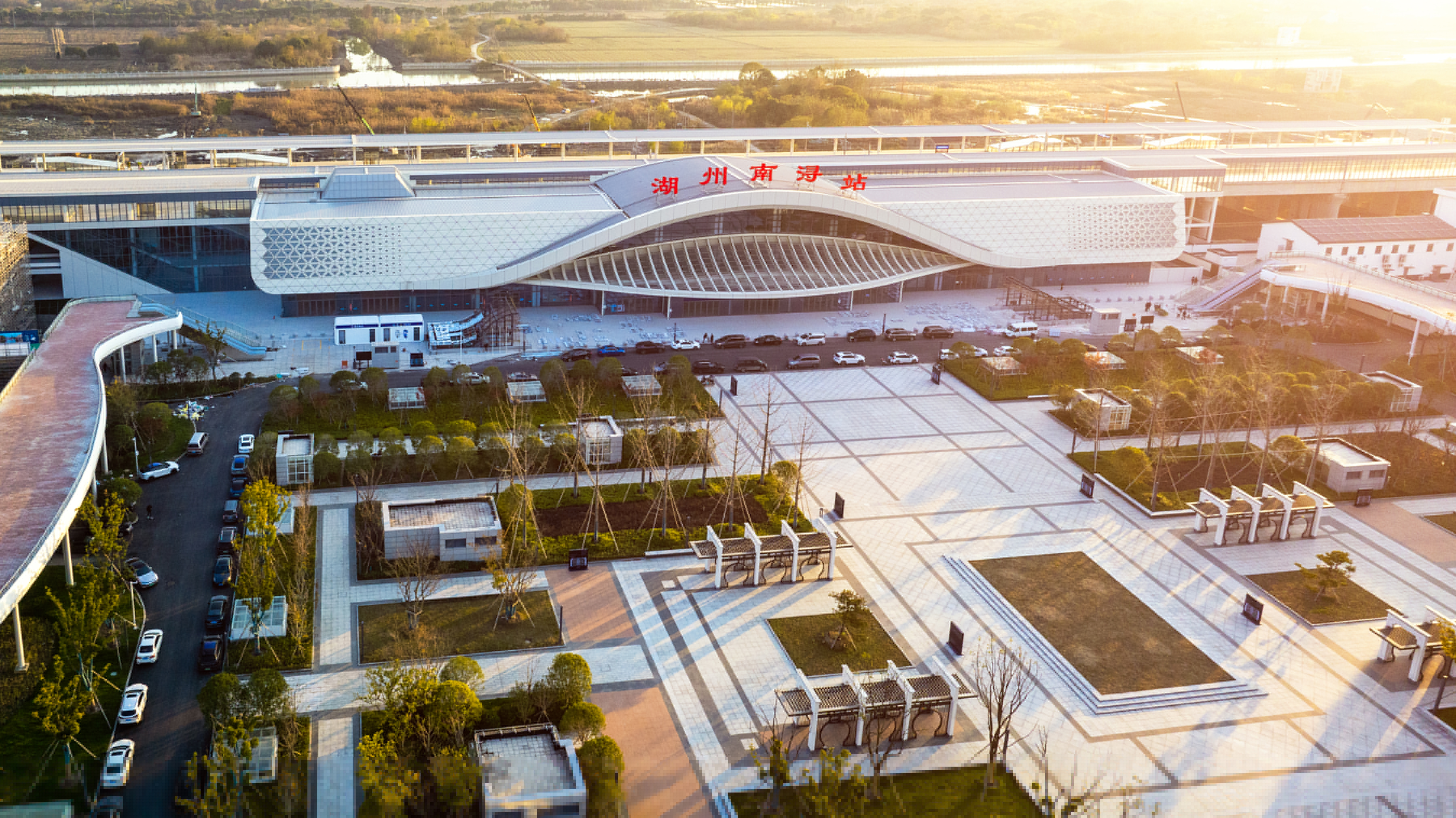 以“泛舟水乡 古镇新韵” 为设计理念,湖州南浔站将南浔水乡的轻舟形象与流水意向巧妙融入站房设计之中,展现出独特的地域文化魅力。