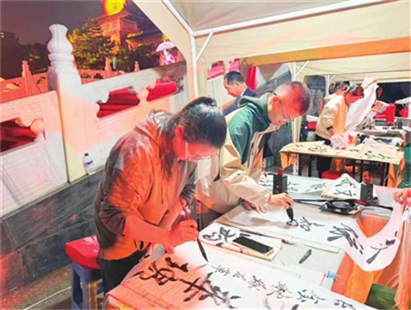 “本来担心下雨影响活动,没想到办得这么贴心!既能看非遗、欣赏书法,还能选文创礼品,这个中秋过得文化味儿十足!”市民刘女士一手撑伞,一手拿着刚领到的书法作品,脸上满是笑意。