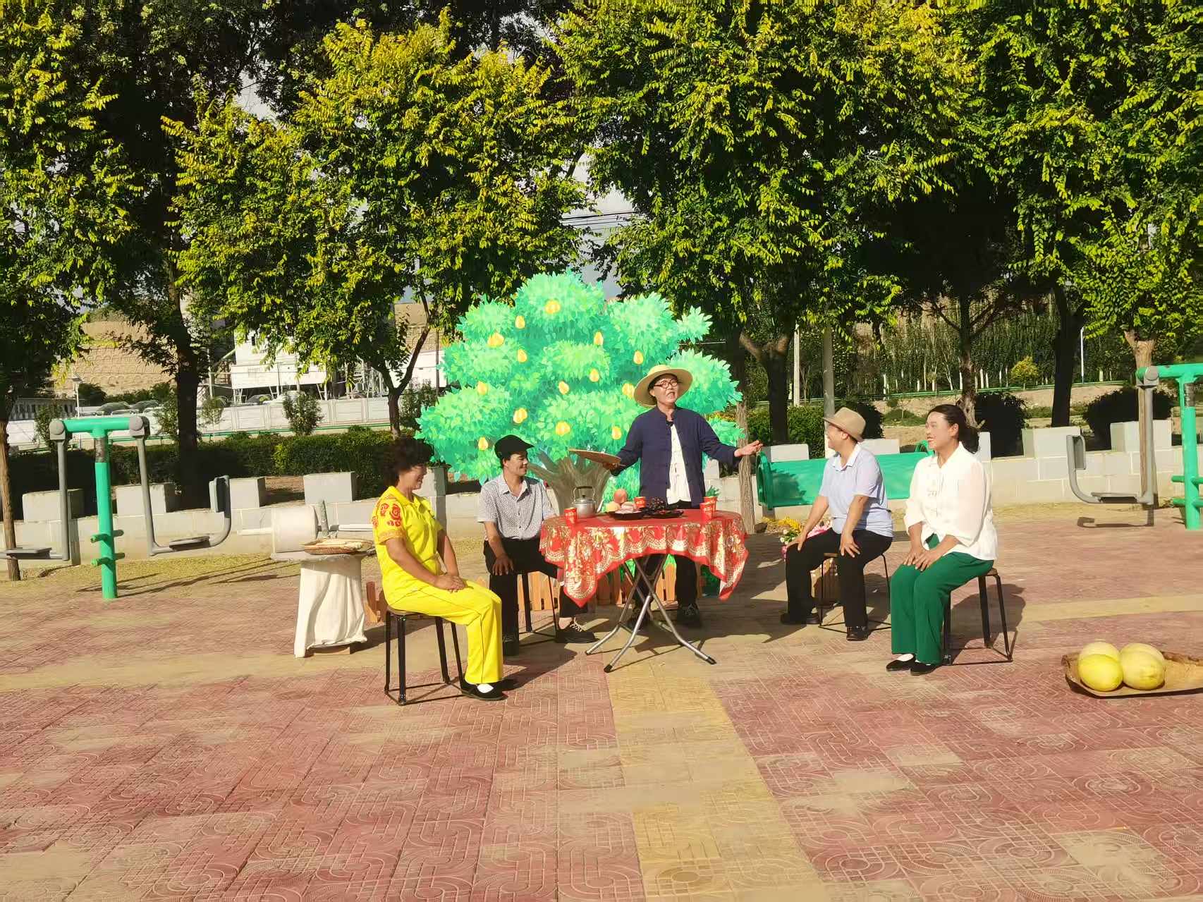 围着一张铺了红桌布的圆桌,在“好大东”的召集下,男女双方父母喜滋滋地讨论着孩子们的婚事。在这样的表演场景中,演员们略带方言却十分接地气的表演,以及朗朗上口的唱词,例如“我家女儿我心疼,嫁女不是卖物件,要的是真心换笑颜”,引得大家在热闹的氛围里沉浸式接受了一次文明的洗礼。