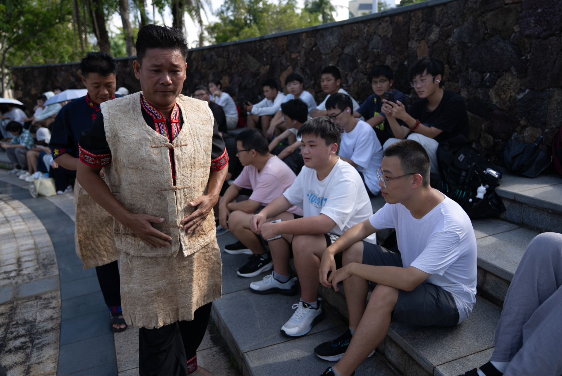 为增强体验感,活动特别邀请了海南省级非遗“黎族钻木取火技艺”代表性传承人王照方及多位县级传承人现场教学。当传承人身着原始质朴的树皮服饰登场时,仿佛从历史中走来,瞬间成为全场焦点。