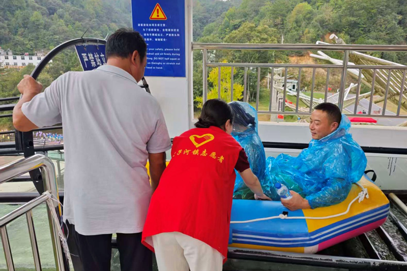 燕子河镇大峡谷景区内,景区工作人员与文明实践志愿者正在为游客进行细致的安全检查、提醒游客注意安全。