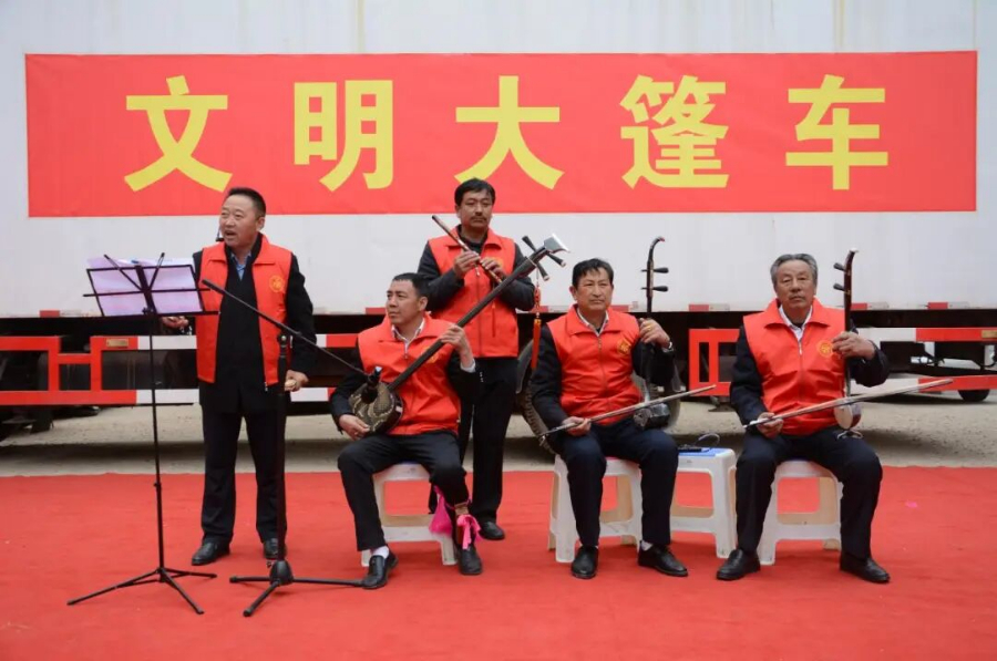 “文明大篷车”志愿者表演陕北说书。图片来源:陕西省委文明办